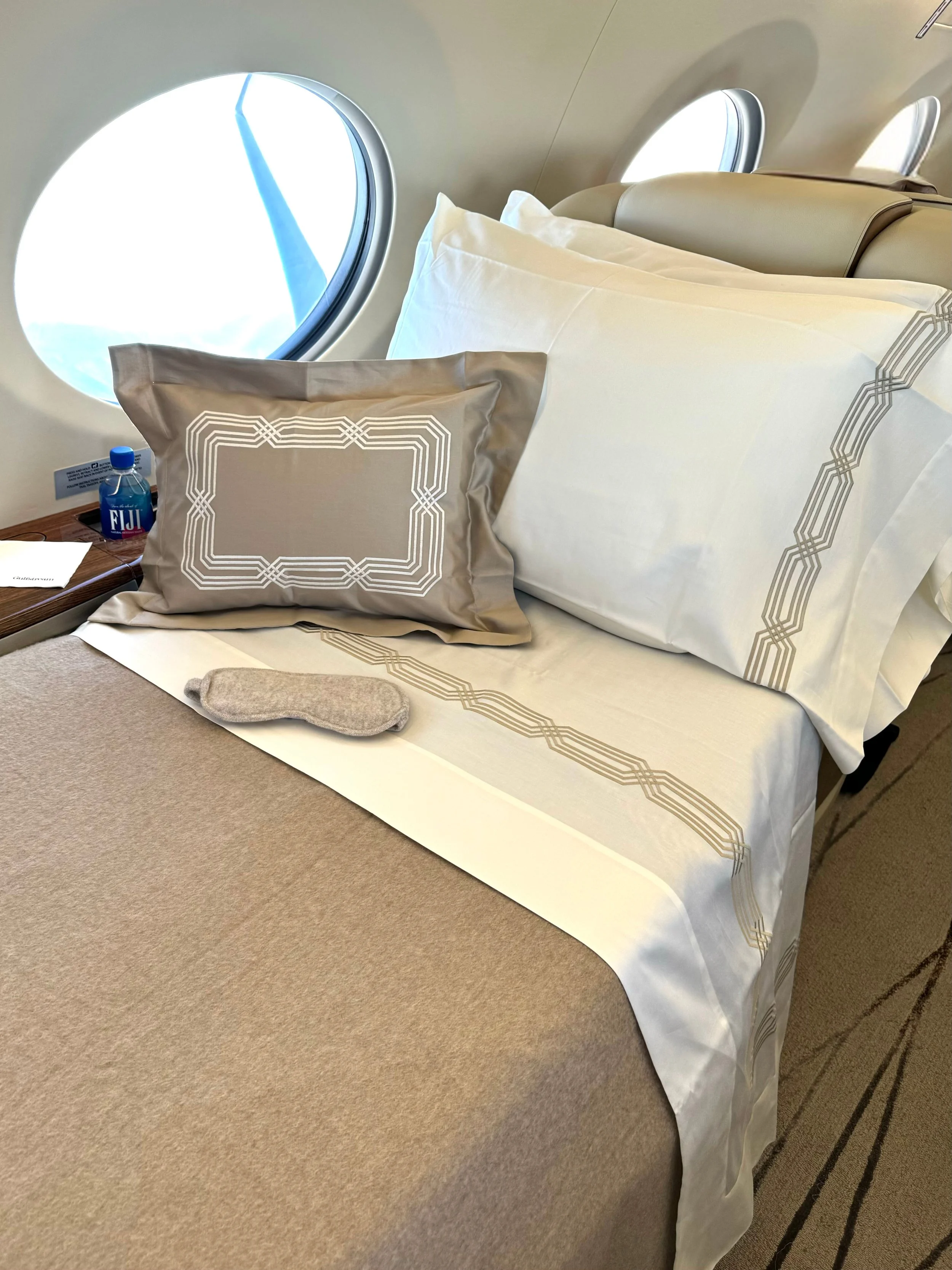 We offer custom made-to-order sheeting that reflects the unique needs of private aircraft and corporate jet designs, layouts, usage and storage. Our offerings include personalized embroidery and labeling options, allowing for customization such as incorporating the aircraft's Tail Number, Charter or Primary/Owner Name.