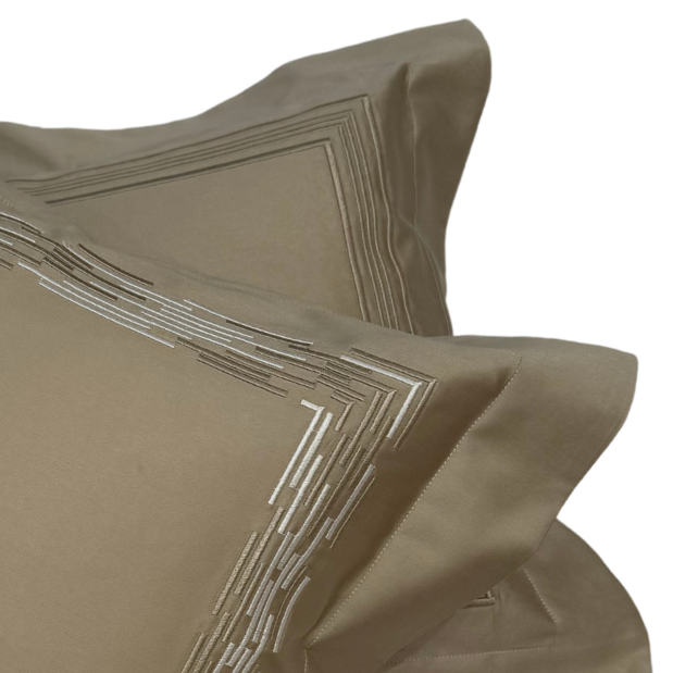 Boudoir Pillow: Showing Six Line embroidery design in Ivory on our Sateen sheeting shown in Sand