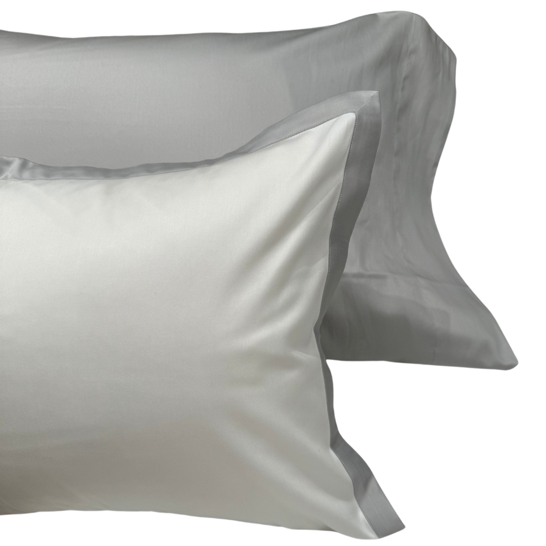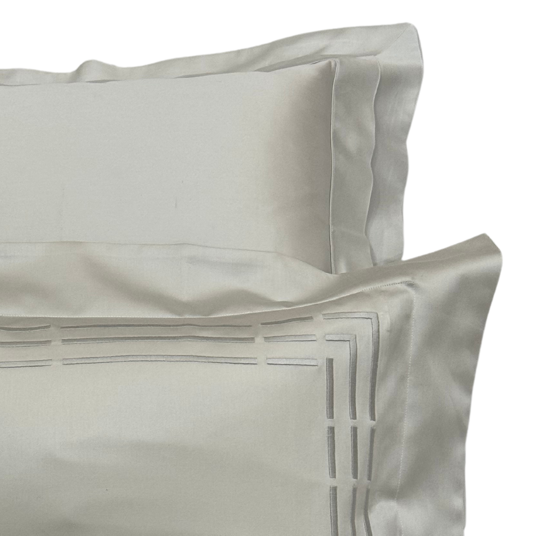 Shown in bespoke color options: Classic Grey Moderno Sateen with Ivory embroidery & Ivory Moderno Sateen with Classic Grey embroidery